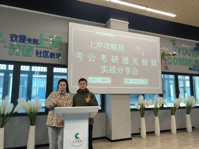 2025年11月29日,赵敬宇老师在上河书院204举办了一场考研考公通关秘籍的实战分享会,邀请了已经上岸的袁洁芳学姐为迷茫中的同学厘清未来选择方向。