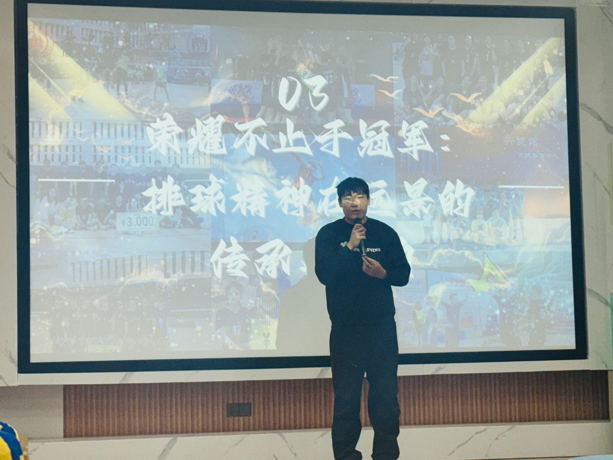 接过传承的接力棒,2024届校友、曾任院排球队队长的赵现雨,则从“责任”与“凝聚”的角度诠释了排球精神。在他看来,队长不仅是技术上的表率,更是团队情绪的“稳压器”和信念的“燃灯者”。他分享了在队伍经历新老交替或比赛陷入逆境时,如何通过坦诚沟通、心理疏导与战术重建,将团队重新凝聚起来的故事。“排球是圆的,比赛有起有落,但队魂不能散。”赵现雨认为,这段经历深刻塑造了他的领导力与责任感,使他明白真正的引领,在于激发每个人的潜能,并让团队始终保持向上的姿态。