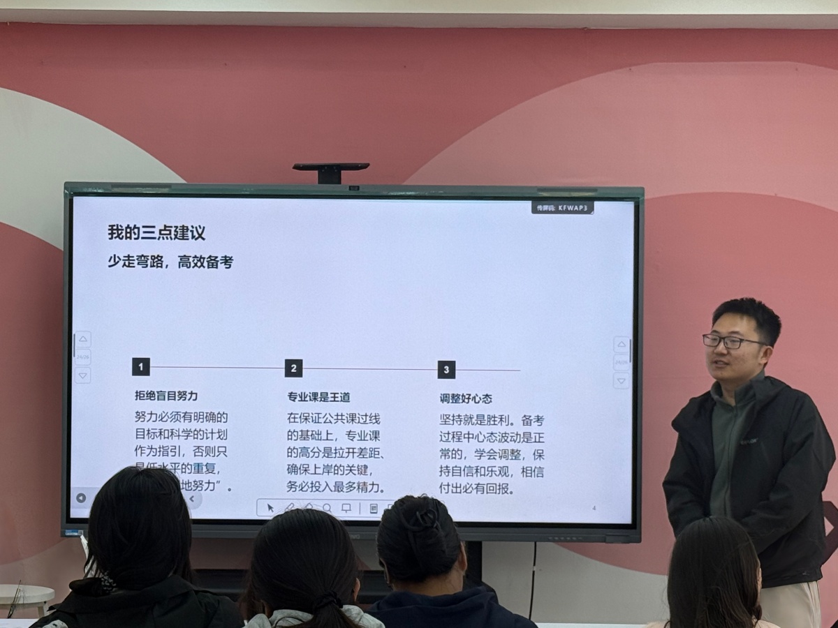 “努力必须有明确的目标和科学的计划作为指引,否则只是低水平的重复。”拒绝盲目努力、重视专业课、调整好心态,是他送给在场同学的三点核心建议。
